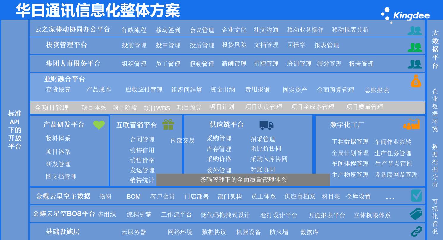 結合行業(yè)洞察分析和對企業(yè)自身企情況及能力的調研,金蝶認為華日通訊需要建立業(yè)務平臺和運營管控平臺,實現深耕產業(yè)下的產業(yè)鏈數字化重塑的雙輪驅動。從集團管控和業(yè)務協同雙向指標逐步建立起華日通訊的IT構建架構。金蝶認為,解決華日通訊當前面臨的挑戰(zhàn),可以基于金蝶云星空平臺的項目管理平臺,通過該項目管理平臺對項目實現事前預測、事中監(jiān)督控制、事后分析的一體化管理,完善企業(yè)項目業(yè)務的全面協同和信息共享體系。