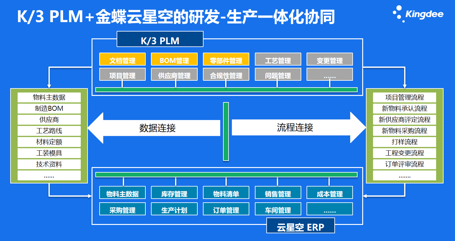 通過K/3 PLM和金蝶云星空的研發(fā)到生產流程的標準化支撐,打通企業(yè)數據和流程連街,實現研發(fā)生產一體化協同: