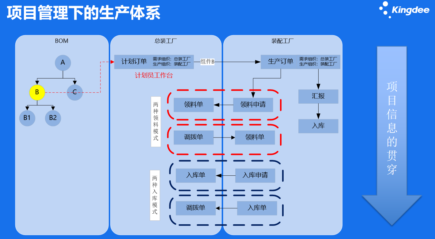 通過項目管理下的生產體系,完善企業(yè)生產從BOM到總裝工廠與裝配工廠的業(yè)務鏈條。通過兩種領料模式和兩種入庫模式解決總裝和裝配工廠之間的領料和入庫的繁雜混亂,幫助生產體系實現有效協同。