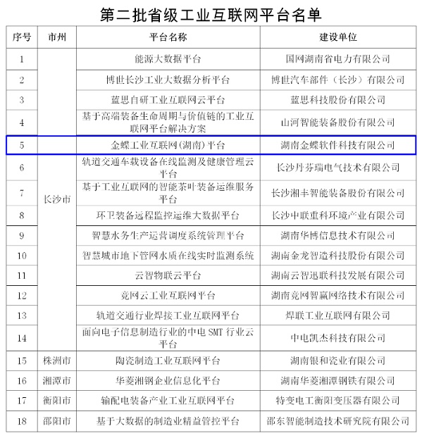 為加快打造國(guó)家重要先進(jìn)制造業(yè)高地,推動(dòng)工業(yè)互聯(lián)網(wǎng)在更廣范圍、更深程度、更高水平上的融合創(chuàng)新,根據(jù)《湖南省省級(jí)工業(yè)互聯(lián)網(wǎng)平臺(tái)認(rèn)定管理辦法》(湘工信人工智能〔2020〕222號(hào)),經(jīng)企業(yè)申報(bào)、市州工信部門(mén)推薦、專(zhuān)家評(píng)審、現(xiàn)場(chǎng)核查、網(wǎng)上公示等程序,湖南省工業(yè)和信息化廳同意認(rèn)定金蝶工業(yè)互聯(lián)網(wǎng)(湖南)平臺(tái)等18個(gè)平臺(tái)為第二批省級(jí)工業(yè)互聯(lián)網(wǎng)平臺(tái)。