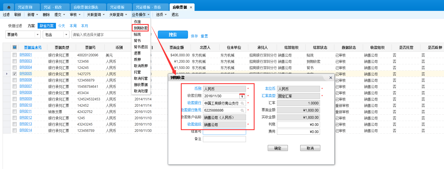 在應(yīng)收票據(jù)列表選中該票據(jù),點(diǎn)擊【業(yè)務(wù)操作】→【到期收款】,在彈出界面維護(hù)收款銀行及賬號(hào)等信息,點(diǎn)擊【確定】,此時(shí)會(huì)生成一張應(yīng)收票據(jù)結(jié)算單,該單據(jù)生成憑證如下:(如圖-1)