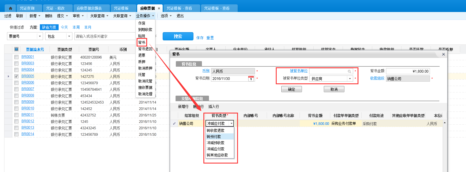 9、應(yīng)收票據(jù)的背書(shū)、背書(shū)退回、退票等操作需要考慮結(jié)算組織與收款組織是否一致,以上均是在結(jié)算組織與收款組織一致下生成的憑證情況,若不同會(huì)有其他應(yīng)收/其他應(yīng)付科目處理結(jié)算組織與收款組織之間的往來(lái);