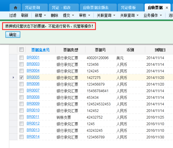 在應(yīng)收票據(jù)列表選中該票據(jù),點(diǎn)擊【業(yè)務(wù)操作】→【質(zhì)押】或【托管】,質(zhì)押和托管不會(huì)產(chǎn)生結(jié)算單,不做賬務(wù)處理,質(zhì)押和托管的票據(jù)不能做其他業(yè)務(wù)操作,只有取消質(zhì)押或者托管才可以進(jìn)行相應(yīng)操作;(如圖-4)