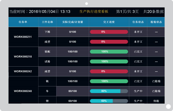 ●通過觸摸屏工作臺實現(xiàn)生產(chǎn)指令的即時下達、傳遞,任務/圖紙的即時查看、快速報工、檢驗等,實現(xiàn)生產(chǎn)過程數(shù)據(jù)信息化、即時化;