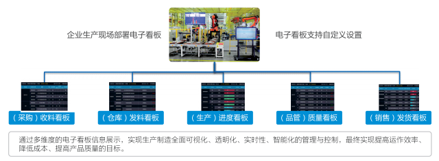 ●系統(tǒng)預設采購收料、倉庫發(fā)料、生產(chǎn)進度、質量、銷售發(fā)貨等看板,并支持全新自定義看板。