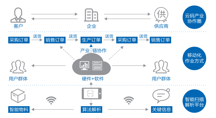 通過移動(dòng)互聯(lián)網(wǎng)技術(shù), 不同用戶群體(采購、銷售、倉存、車間)均可進(jìn)行掃碼手通過智 能掃描解析平臺(tái),實(shí)現(xiàn)手機(jī)對(duì)物料條碼的數(shù)字化訪問,對(duì)關(guān)鍵信息自動(dòng)處理,實(shí)現(xiàn)線上線下的無縫銜接。